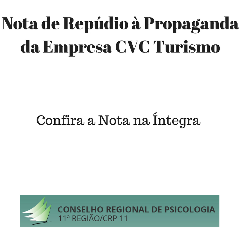 O Conselho Regional de Psicologia da 11º Região (CRP 11) vem a público manifestar seu repúdio à Empresa CVC Turismo por esta ter veiculado propaganda em suas mídias oficiais em que há desrespeito à categoria de psicólogos e psicólogas. Confira a nota na íntegra no link abaixo: