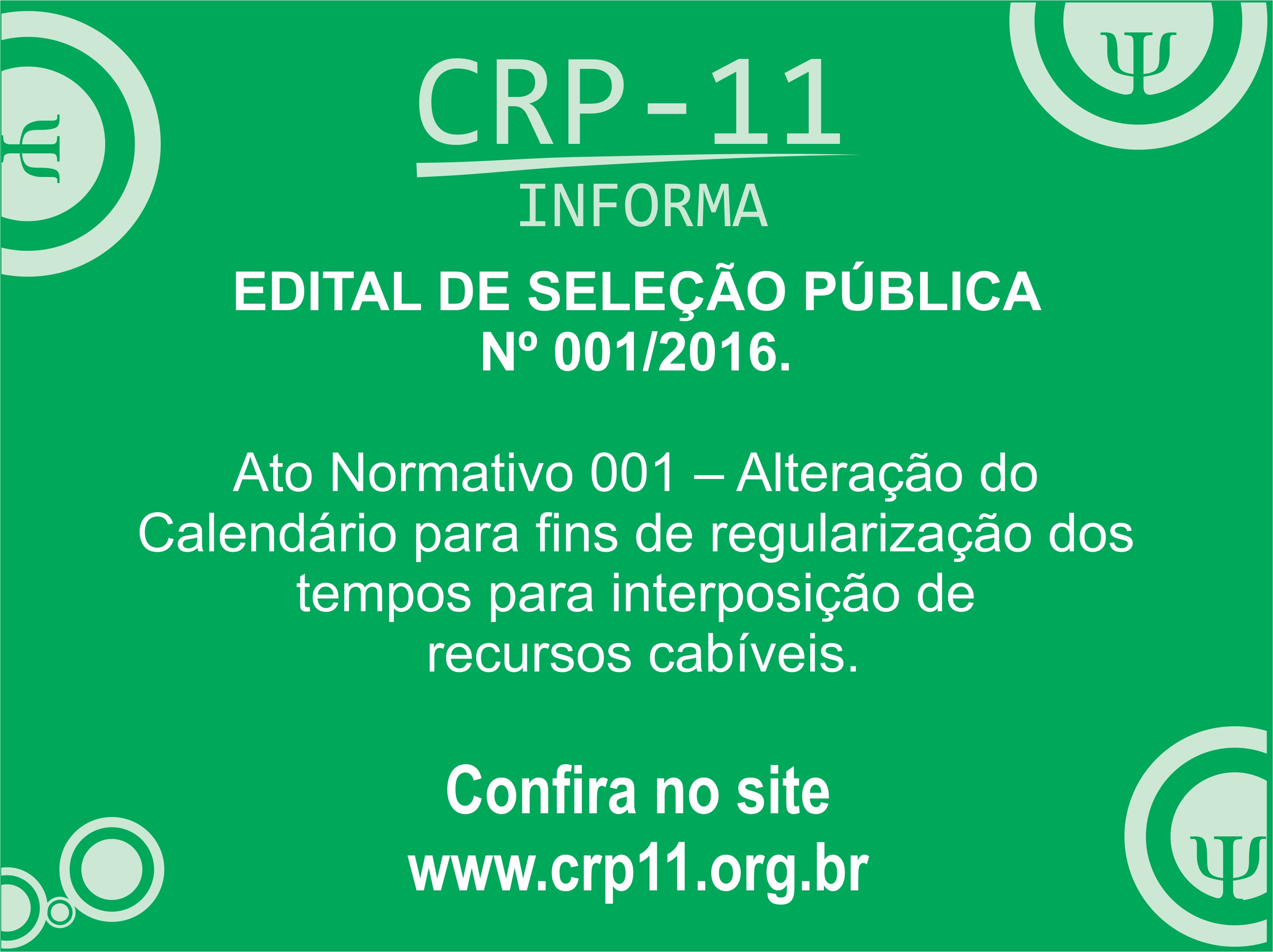 EDITAL DE SELEÇÃO PÚBLICA Nº 001/2016. SELEÇÃO PÚBLICA PARA HABILITAÇÃO DESTINADA AO PREENCHIMENTO DE UMA VAGA PARA O CARGO DE PSICÓLOGO (A) FISCAL E COMPOSIÇÃO DE BANCO DE DADOS PARA FISCAL DO CRP 11.