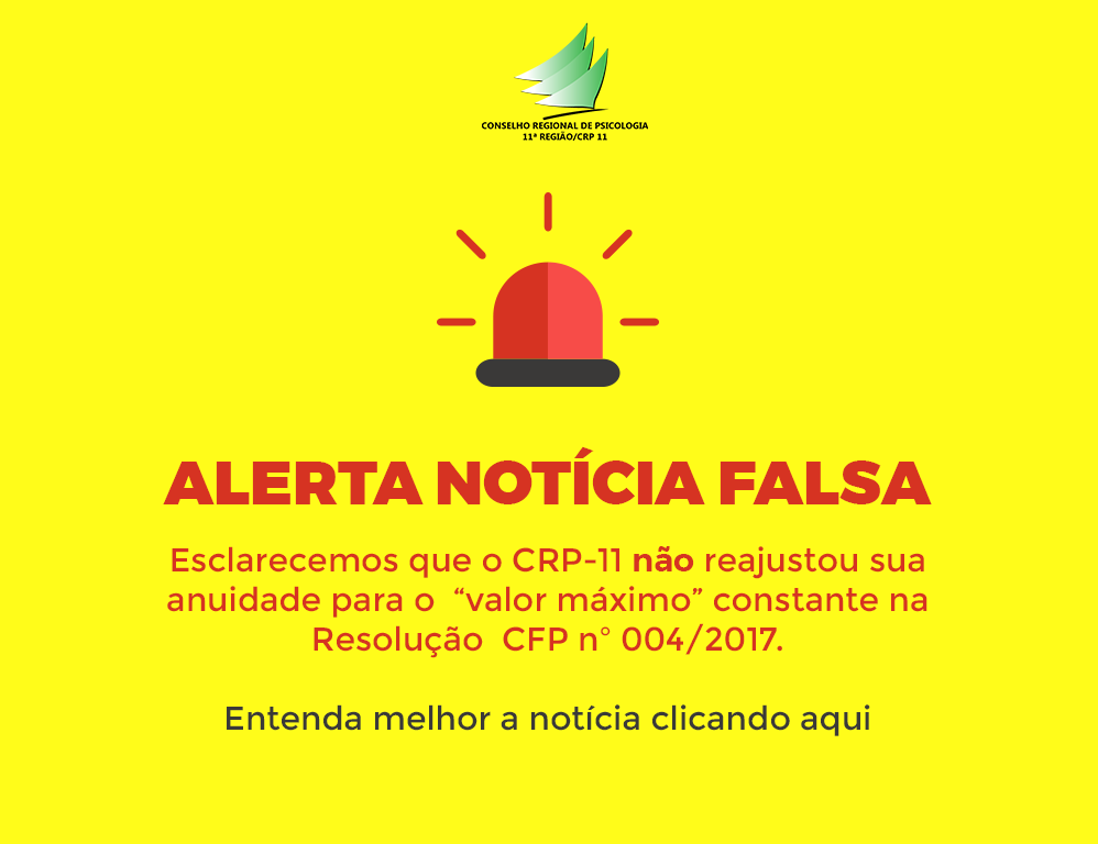 Chegou ao conhecimento deste Conselho Regional, na data de 24 de outubro de 2017, que estaria circulando um arquivo (em formato de imagem e PDF) com as Resolução CFP nº 004/2017 afirmando que os valores contidos neste documento são os valores de anuidade do CRP 11. Trata-se de informação falsa. A referida resolução é verdadeira e foi aprovada pelo Conselho Federal de Psicologia em maio de 2017 estipulando os valores máximos que podem ser cobrados pelos Conselhos Regionais de Psicologia quando forem reajustar suas anuidades em assembleias competentes, constante no valor de R$ 623,68. Todavia, este não é o valor da anuidade de pessoa física do CRP 11. Fiquem atentos(as)!