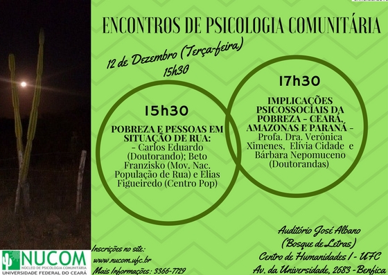 O Núcleo de Psicologia Comunitária (NUCOM-UFC) realiza os Encontros de Psicologia Comunitária na próxima terça-feira (12), e convida a categoria e a comunidade acadêmica a fazerem-se presentes nas mesas “Pobreza e Pessoas em Situação de Rua” e "Implicações psicossociais da pobreza". Na ocasião, também haverá o lançamento da cartilha “Implicações Psicossociais da Pobreza - Ceará, Amazonas e Paraná”.