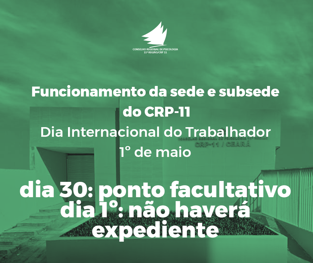 Em razão do feriado de 1º de maio, dia internacional do Trabalhador, e seguindo o entendimento, por analogia do mérito, disposto nos Decretos que tratam desta matéria do Governo do Estado do Ceará e da Prefeitura Municipal de Fortaleza, o Conselho Regional de Psicologia 11ª Região delibera que: