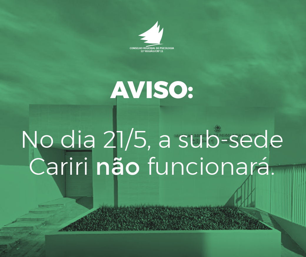 O Conselho Regional de Psicologia 11ª Região delibera que no dia 21/05 (segunda-feira), não funciona a sub-sede Cariri do CRP11.
