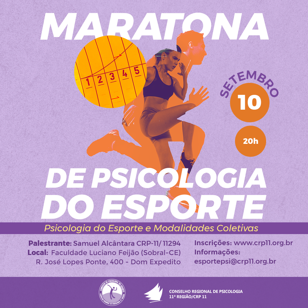 A Comissão de Psicologia do Esporte do Conselho Regional de Psicologia 11ª Região realiza o 6º encontro da Maratona de Psicologia do Esporte, no dia 10 de SETEMBRO de 2018, desta vez na cidade de Sobral, após um ciclo de palestras sobre Psicologia do Esporte na capital Fortaleza.