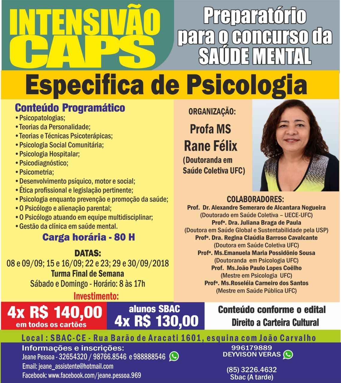 Estão abertas as inscrições do “INTENSIVÃO CAPS- PREPARATÓRIO PARA O CONCURSO DA SAÚDE MENTAL- ESPECÍFICA DE SAÚDE MENTAL” para o concurso de Fortaleza para a RAPS da PMF, no qual serão destinadas 37 vagas para a Psicologia. O curso será realizado na SBAC/CE, situada na R. Barão de Aracati, 1601, Aldeota, em Fortaleza.