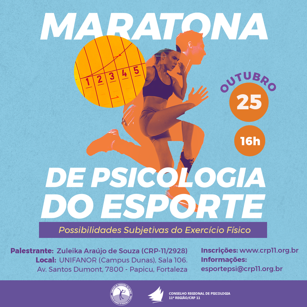 A Comissão de Psicologia do Esporte do Conselho Regional de Psicologia 11ª Região realiza mais uma Maratona de Psicologia do Esporte, no dia 25 de outubro de 2018, sediada na UNIFANOR Campus Dunas, em Fortaleza.