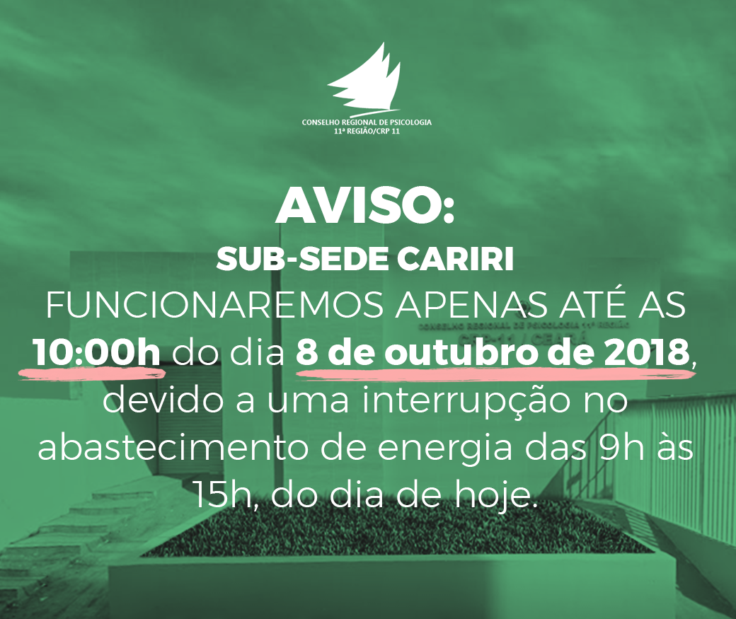 O Conselho Regional de Psicologia 11ª Região informa que, devido a uma interrupção no abastecimento de energia das 9h às 15h de hoje, dia 8 de outubro de 2018, o CRP11 na subsede Cariri terá expediente apenas até as 10:00h.