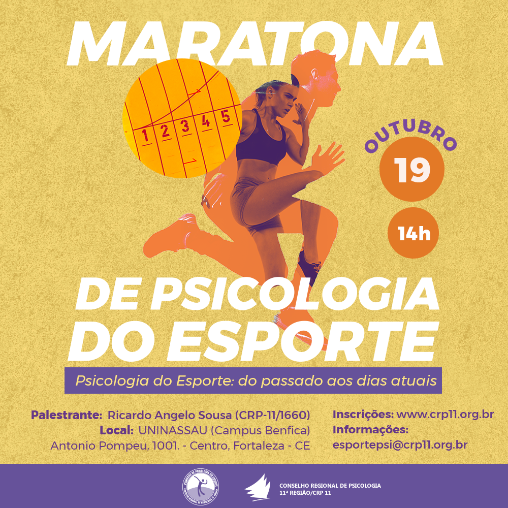 A Comissão de Psicologia do Esporte do Conselho Regional de Psicologia 11ª Região realiza mais uma Maratona de Psicologia do Esporte, no dia 19 de outubro de 2018, sediada na Uninassau-Benfica.