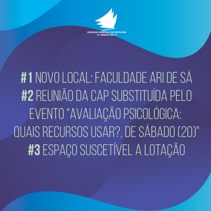 Em detrimento do evento promovido pela Comissão de Avaliação Psicológica, a reunião da CAP que ocorreria no dia 20 de outubro será substituída pela discussão "Avaliação Psicológica: Quais recursos usar?", sediada na Faculdade Ari de Sá, às 9h.