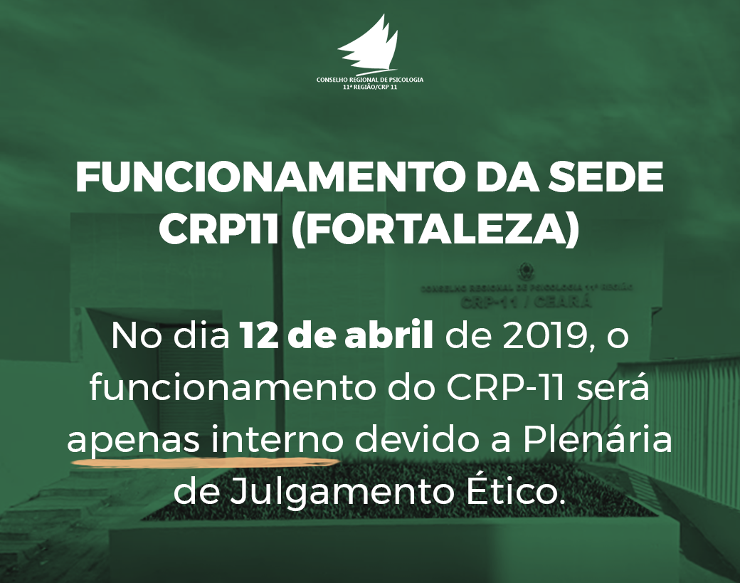 AVISO DE FUNCIONAMENTO: Informamos que no dia 12 de abril, o funcionamento do CRP-11 (Fortaleza) será apenas interno devido a Plenária de Julgamento Ético.