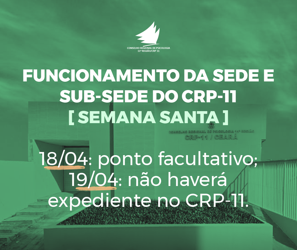 O Conselho Regional de Psicologia 11ª Região delibera, CONSIDERANDO o feriado da Semana Santa e seguindo o entendimento, por analogia do mérito, disposto nos Decretos que tratam desta matéria do Governo do Estado do Ceará, da Prefeitura Municipal de Fortaleza e da Prefeitura Municipal de Juazeiro do Norte,