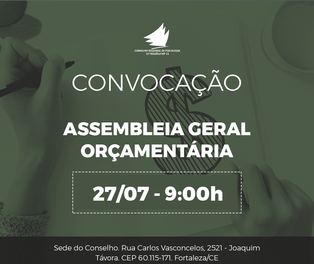O Conselho Regional de Psicologia 11ª Região convoca as(os) psicólogas(os) inscritas(os) neste Conselho a constituírem ASSEMBLEIA GERAL ORÇAMENTÁRIA, a realizar-se na sede, localizada na Rua Carlos Vasconcelos, 2521, Joaquim Távora, Fortaleza – CE, no dia 27 de JULHO de 2019, às 09h, em primeira convocação, com maioria absoluta do(a)s psicólogo(a)s e, às 9h e 30 min, em segunda convocação, com qualquer número de participantes com a finalidade de aprovação do orçamento de 2020.
