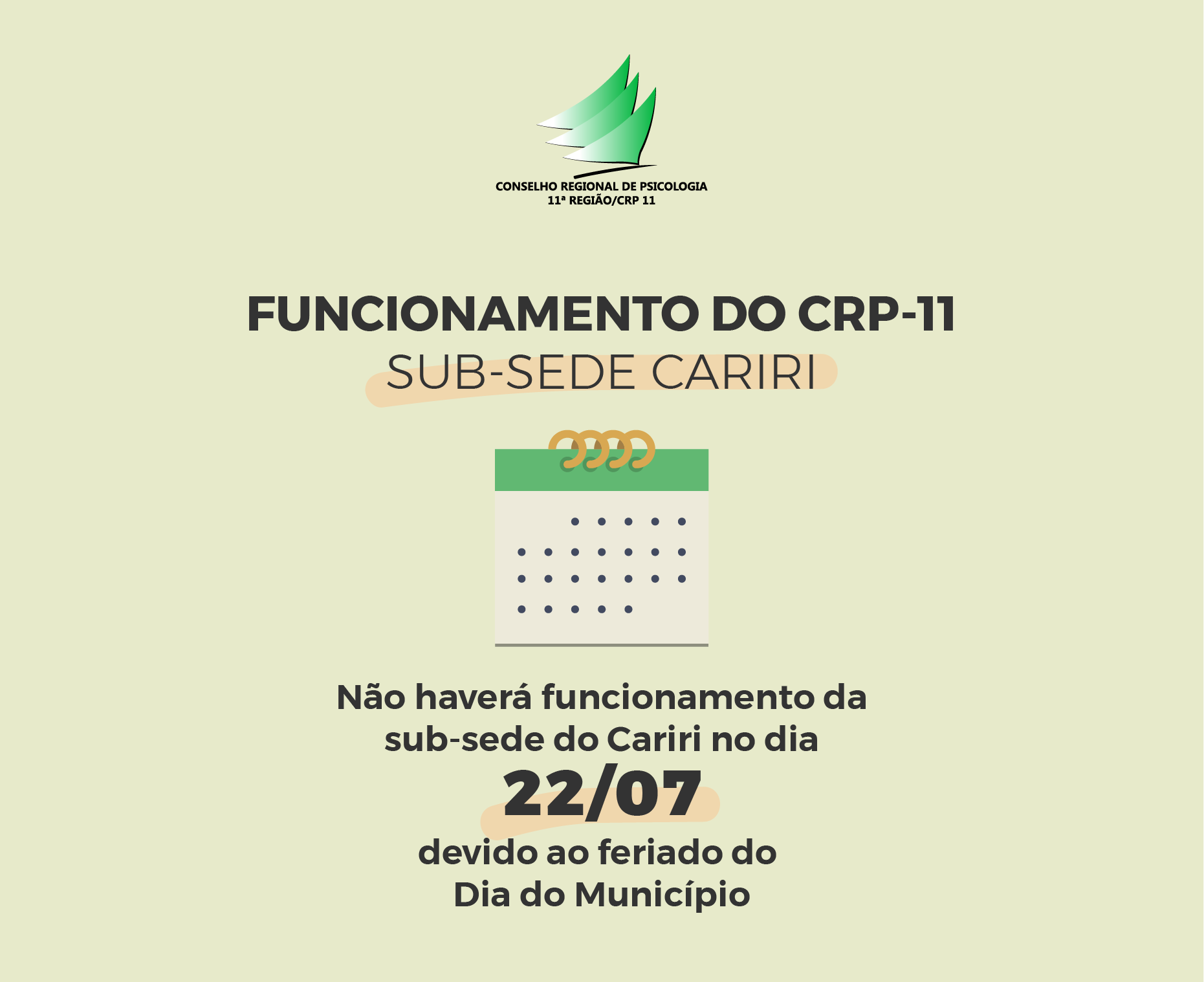 Avisamos que no dia 22 de julho de 2019, não haverá funcionamento na sub-sede Cariri do CRP-11 devido a feriado do Dia do Município.