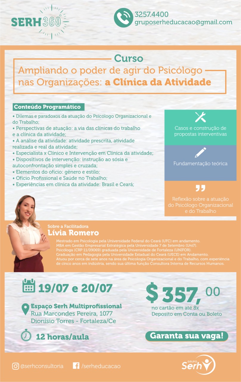 O curso é voltado para Psicólogos Organizacionais do Trabalho e estudantes de Psicologia. a ministrante é a psicóloga e pedagoga Lívia Romero de Moura (CRP 11/09069), graduada pela Universidade de Fortaleza (UNIFOR), mestranda em Psicologia pela Universidade Federal do ceará (UFC), e com MBA em Gestão Empresarial Estratégica pela Universidade 7 de Setembro (Uni7). O investimento é de R$ 357,00 (no cartão em até 8x, boleto ou depósito em conta).