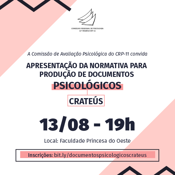 A Comissão de Avaliação Psicológica do CRP-11 promove, no dia 13 de agosto de 2019, o debate “Apresentação da normativa para produção de documentos psicológicos”, a partir de 19h, na Faculdade Princesa do Oeste, na cidade de Crateús-CE.