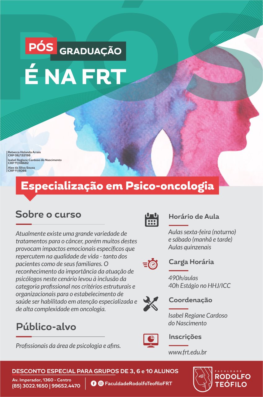 A Faculdade Rodolfo Teófilo oferta o curso de Especialização em Psico-oncologia e tem inscrições abertas. O curso é destinado a psicólogas(os), possui aulas quinzenais e uma carga horária de 490 horas (sendo 40 horas de estágio).
