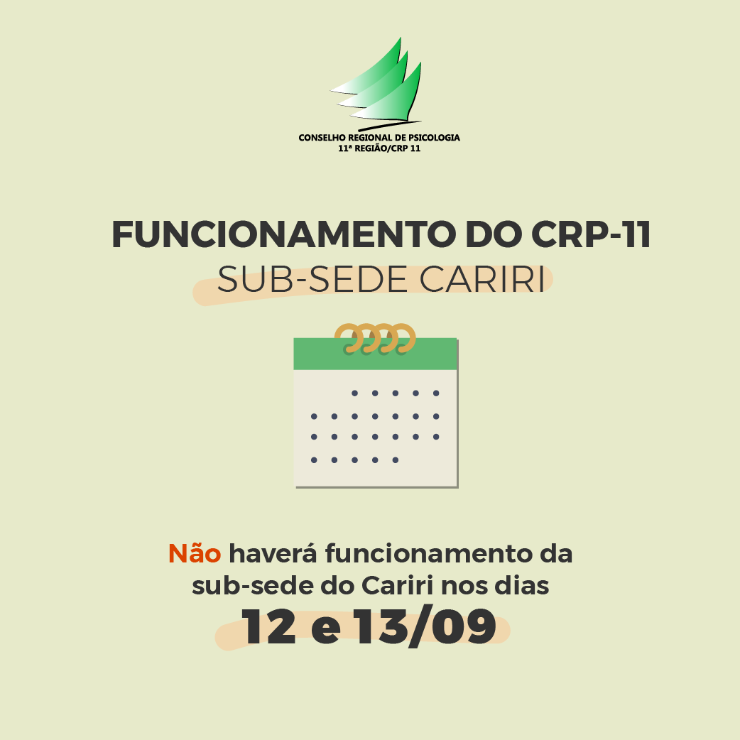 O CRP-11 informa que não haverá funcionamento da sub-sede Cariri nos dias 12 e 13 de setembro de 2019.