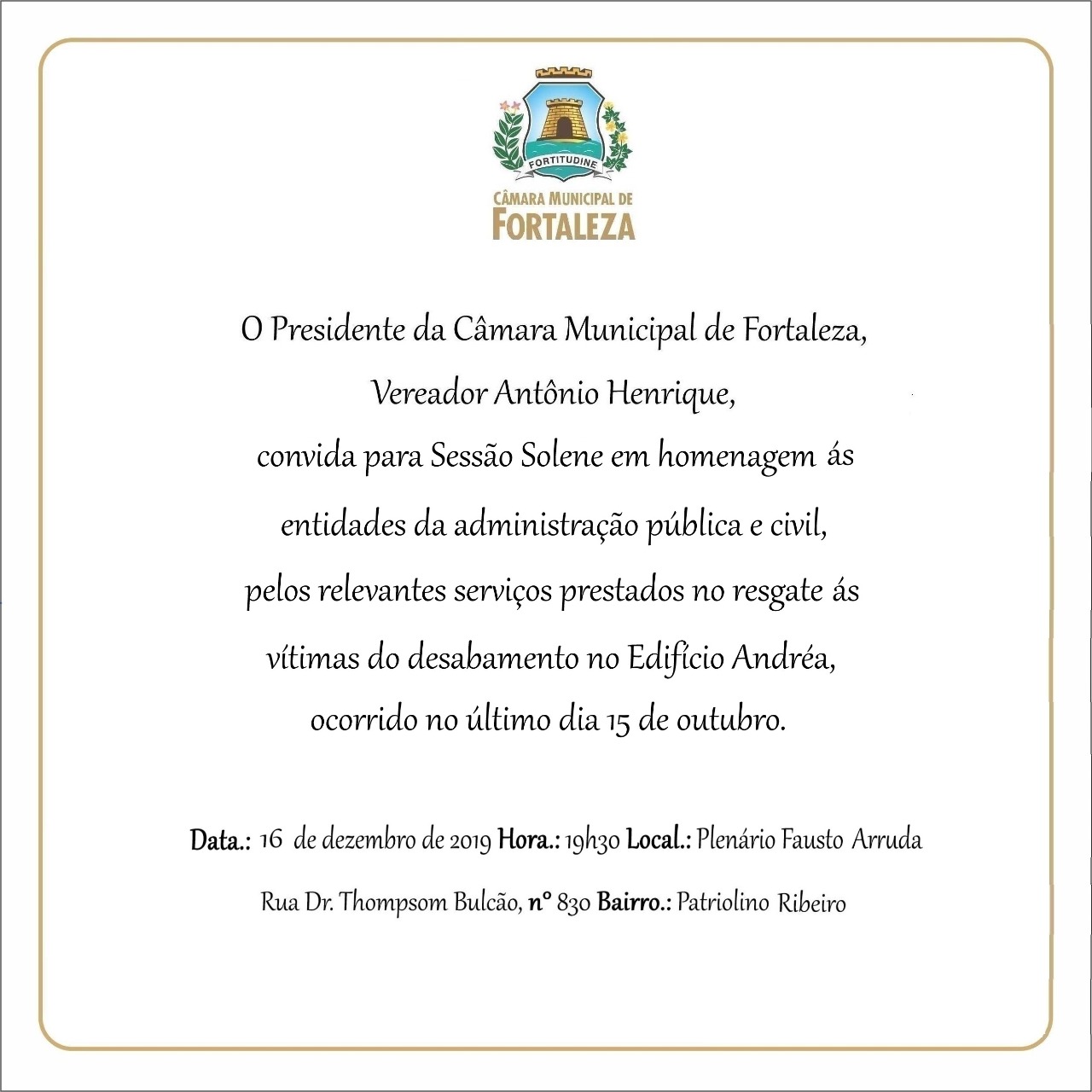 O CRP-11 endossa o convite à Sessão Solene em homenagem às entidades da administração pública e civil, pelos serviços prestados no resgate às vítimas do desabamento no Edifício Andréa, no dia 16 de dezembro às 19:30h, no Plenário Fausto Arruda, localizado na Rua Thompson Bulcão, 830 - Patriolino Ribeiro.