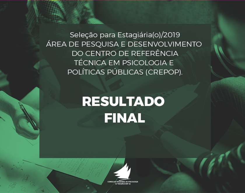 Acaba de ser publicado Resultado FINAL da seleção pública para habilitação destinada à composição de cadastro de reserva e preenchimento de 01 vaga para estágio na área de Pesquisa E Desenvolvimento do Centro De Referência Técnica em Psicologia e Políticas Públicas (CREPOP).