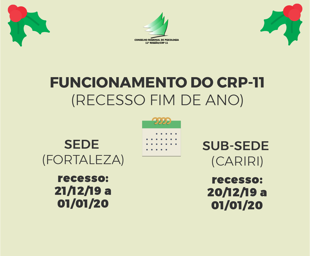 - RECESSO NA SEDE (FORTALEZA): expediente interno a partir das 11:00h no dia 20/12; 21/12/19 a 01/01/20