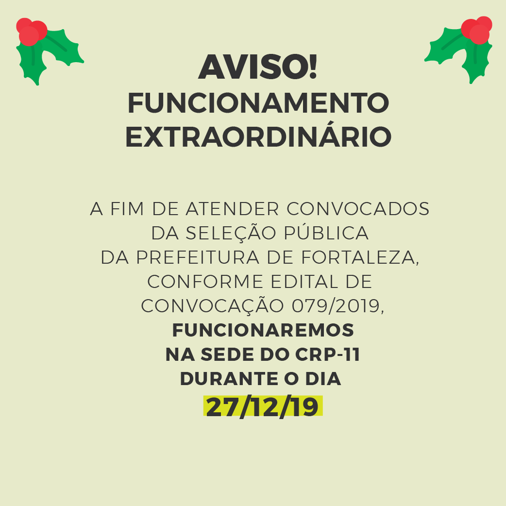 Por conta da seleção pública da Prefeitura de Fortaleza, estaremos com funcionamento extraordinário no dia 27 de dezembro de 2019, das 8h às 12h, na sede do CRP-11 apenas para atender os convocados.
