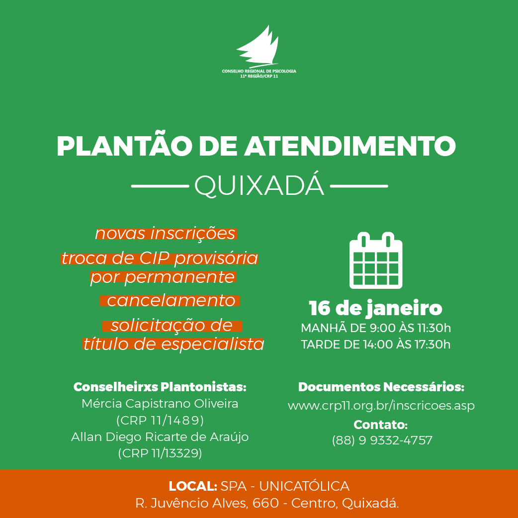 Aguardamos as(os) profissionais interessadas (os) no SPA da UNICATÓLICA de Quixadá, localizado na Rua Juvêncio Alves, 660 - Centro, Quixadá. Mais info: crp11@crp11.org.br ou (88) 99332.4757