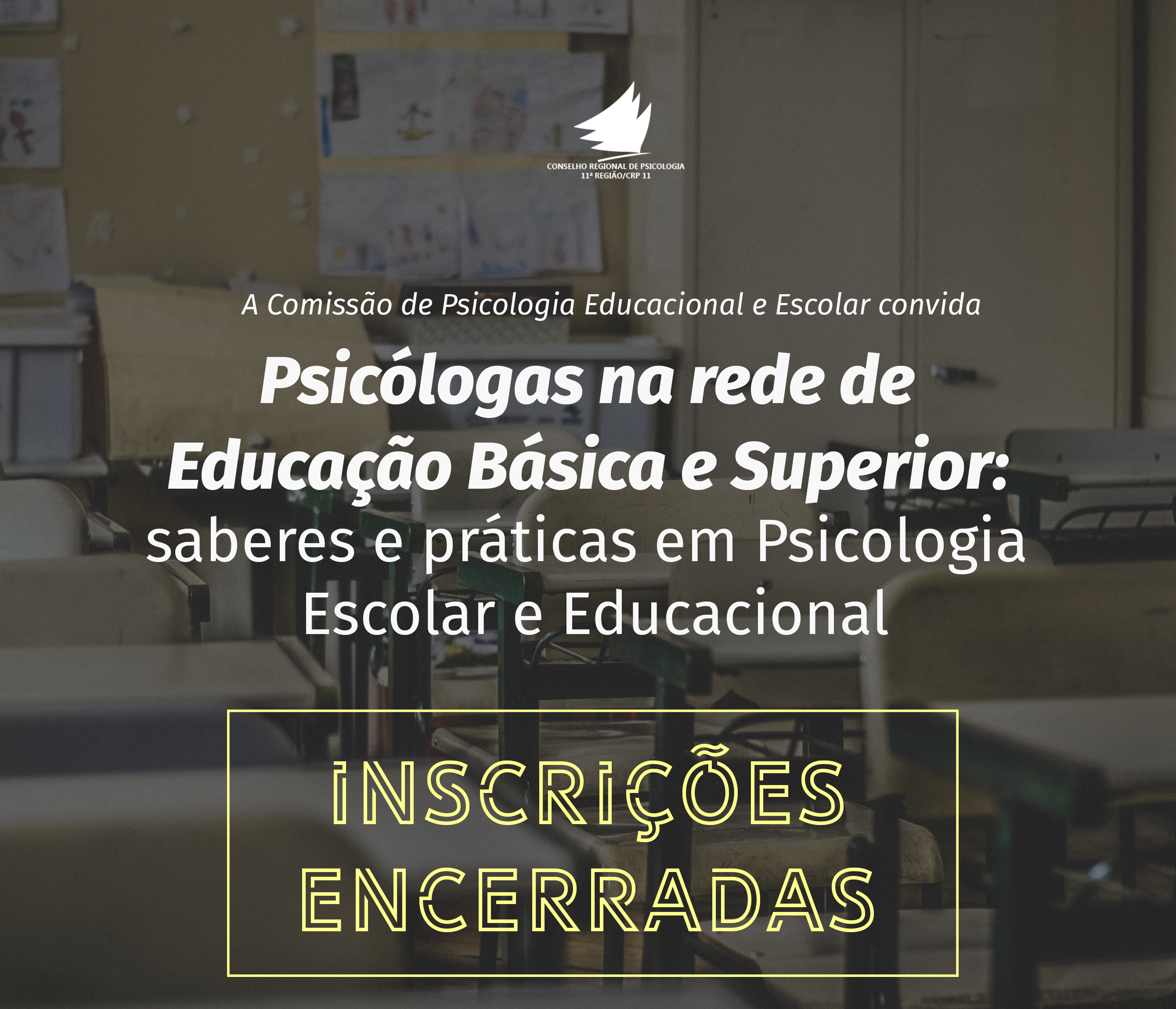 A Comissão de Psicologia Educacional e Escolar informa que estão encerradas as inscrições para o evento “Psicólogos na rede de Educação Básica e Superior: saberes e práticas em psicologia Escolar e educacional”, que ocorrerá no dia 29 de fevereiro de 2020 (Sábado).
