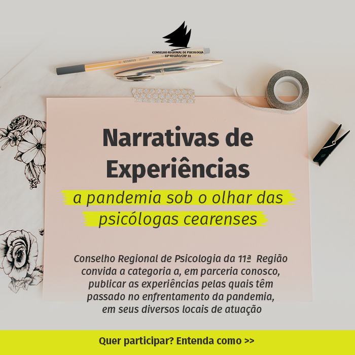 “Narrativas de Experiências: a pandemia sob o olhar das psicólogas cearenses” reunirá relatos de experiências e produções artísticas (poemas, desenhos, fotografia, canções, crônicas, dentre outros) em publicações nas nossas mídias sociais, sem cunho científico mas com o objetivo de mostrar quem somos, as experiências pelas quais passamos e o olhar que voltamos sobre elas.