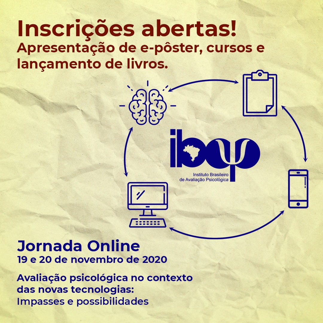 Acontece nos dias 19 e 20 de novembro de 2020 o Jornada Online, realizado pelo IBAP - Instituto Brasileiro de Avaliação Psicológica, que nesta edição, discute a Avaliação Psicológica no contexto das novas tecnologias: impasses e possibilidades. O evento visa a contribuir com os grandes desafios que estamos vivenciando na atualidade, incluindo mudanças no fazer profissional, no campo de ensino e da pesquisa.