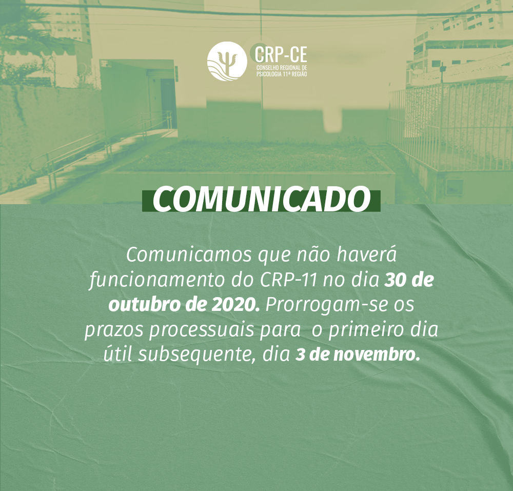 Psicólogas, informamos que não haverá funcionamento no CRP-11 no dia 30 de outubro de 2020, data em que será gozado o feriado do Dia do Servidor Público.
