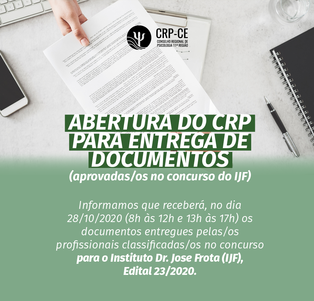 O CRP-11 informa que para os profissionais que foram classificados no concurso para o Instituto Dr. Jose Frota (IJF), Edital 23/2020, o CRP-11 estará aberto dia 28/10/2020 (8h às 12h e 13h às 17h) para entrega de documentos aos profissionais.