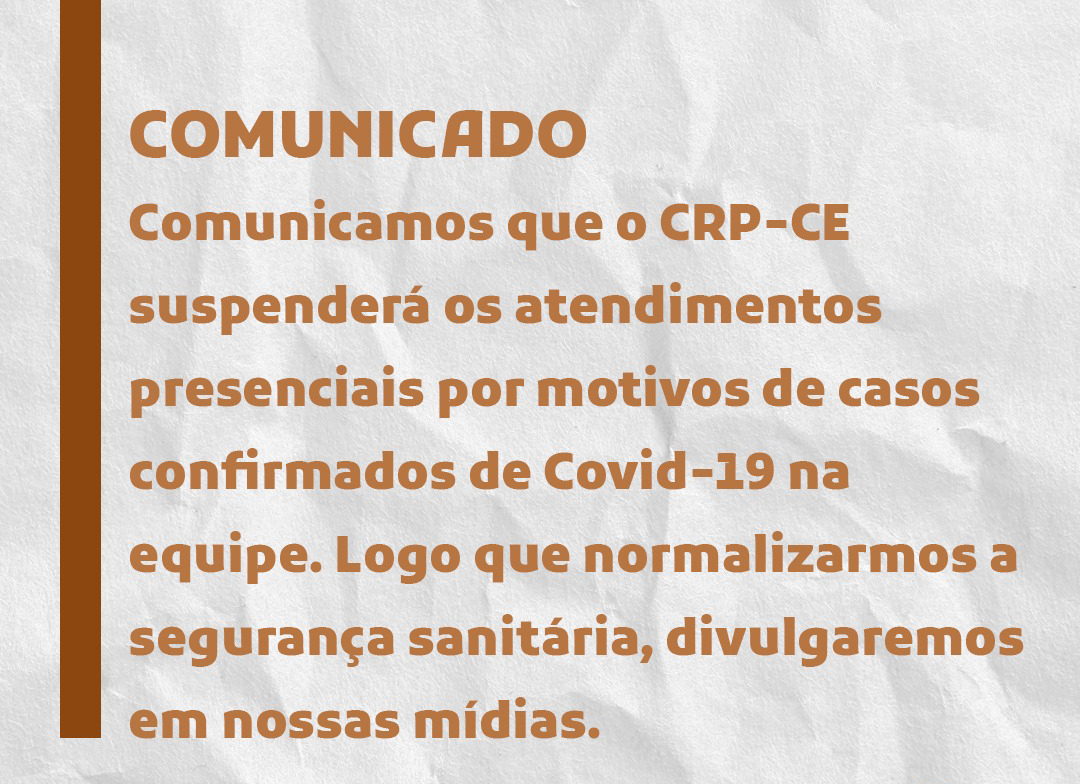 Prezadas psicólogas, durante a semana uma pessoa da nossa equipe da sede em Fortaleza testou positivo para Covid-19 e outro caso está sub suspeita, aguardando o resultado. Para preservar a segurança de todos, todas e todes, os atendimentos presenciais estão suspensos.