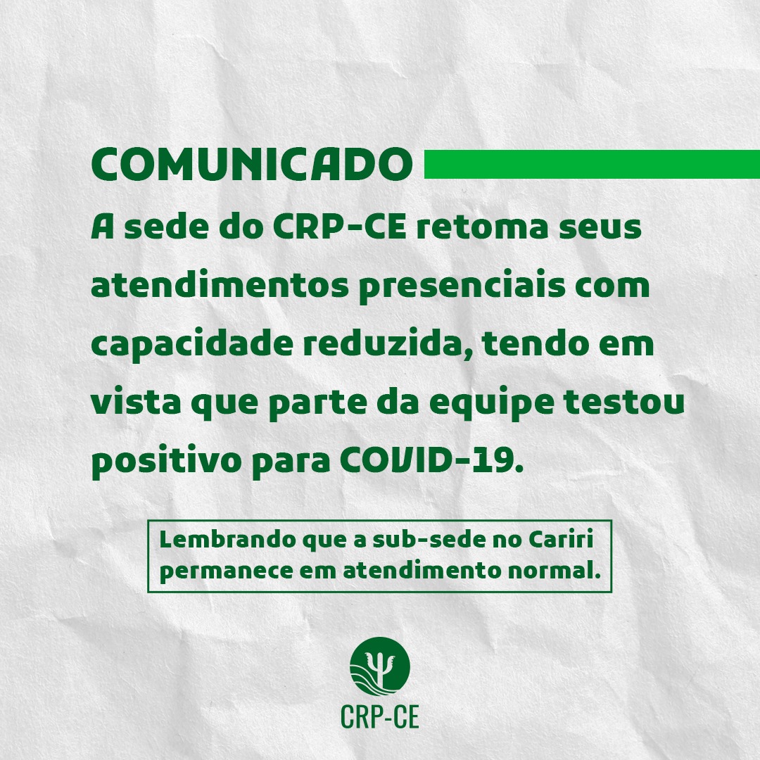 Prezadas psicólogas, o CRP-CE retoma os atendimentos presenciais de todos os seus serviços na sede em Fortaleza. No entanto, devido parte da equipe estar afastada por ter testado positivo para Covid-19, os atendimentos também serão reduzidos, sendo permitido a entrada de apenas 2 profissionais por vez.